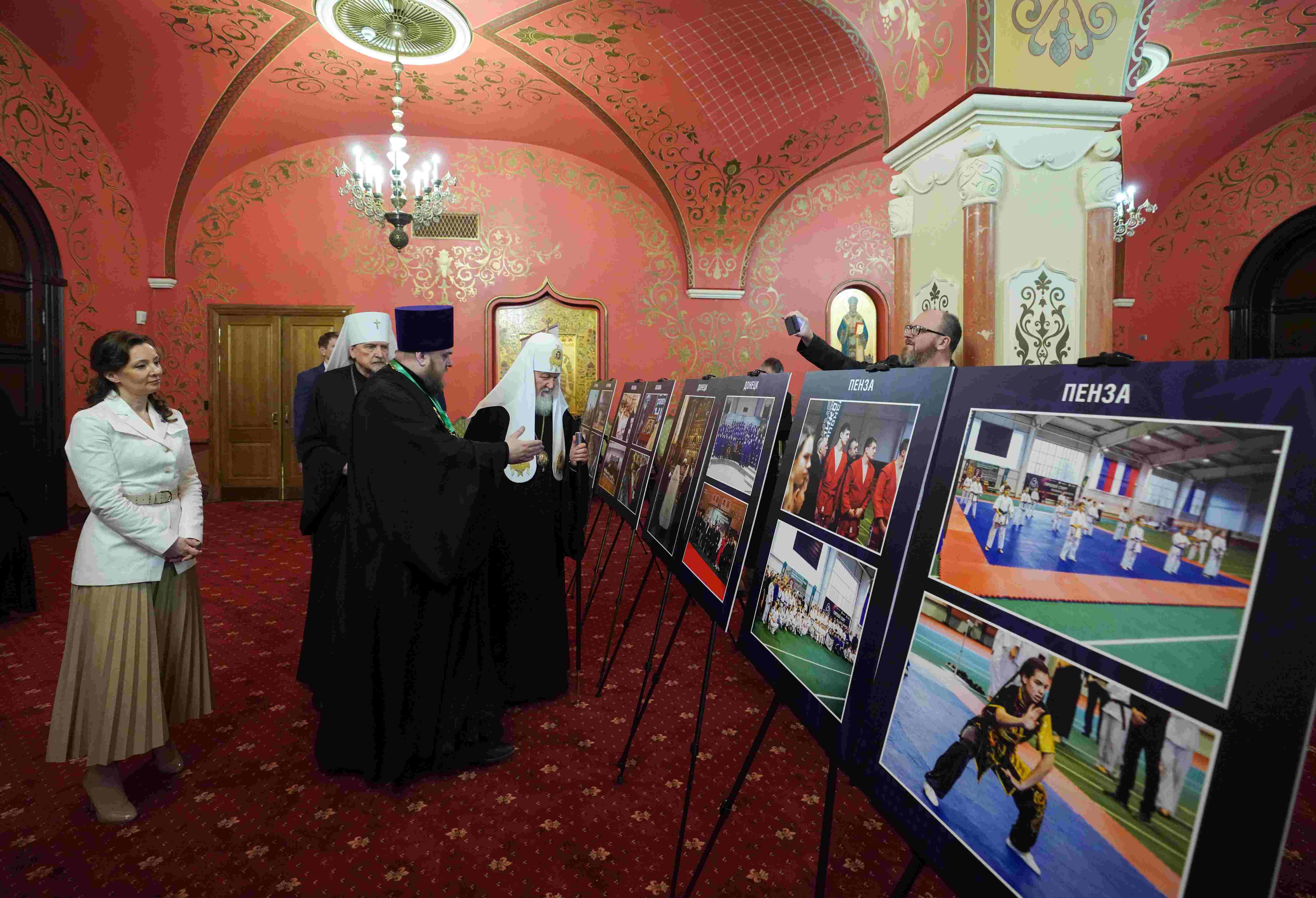 В ходе осмотра экспозиции Святейшего Владыку сопровождали: председатель Патриаршей комиссии по вопросам физической культуры и спорта митрополит Мурманский и Мончегорский Митрофан; личный секретарь Святейшего Патриарха Кирилла епископ Раменский Алексий; член Патриаршей комиссии по вопросам физической культуры и спорта протоиерей Кирилл Соколов; заместитель председателя Государственной Думы Федерального Собрания Российской Федерации, председатель Попечительского совета фестиваля А.Ю. Кузнецова; министр спорта РФ М.В. Дегтярев; директор Департамента информации и печати Министерства иностранных дел РФ М.В. Захарова; президент благотворительного Фонда «Русский крест» Е.О. Благов.