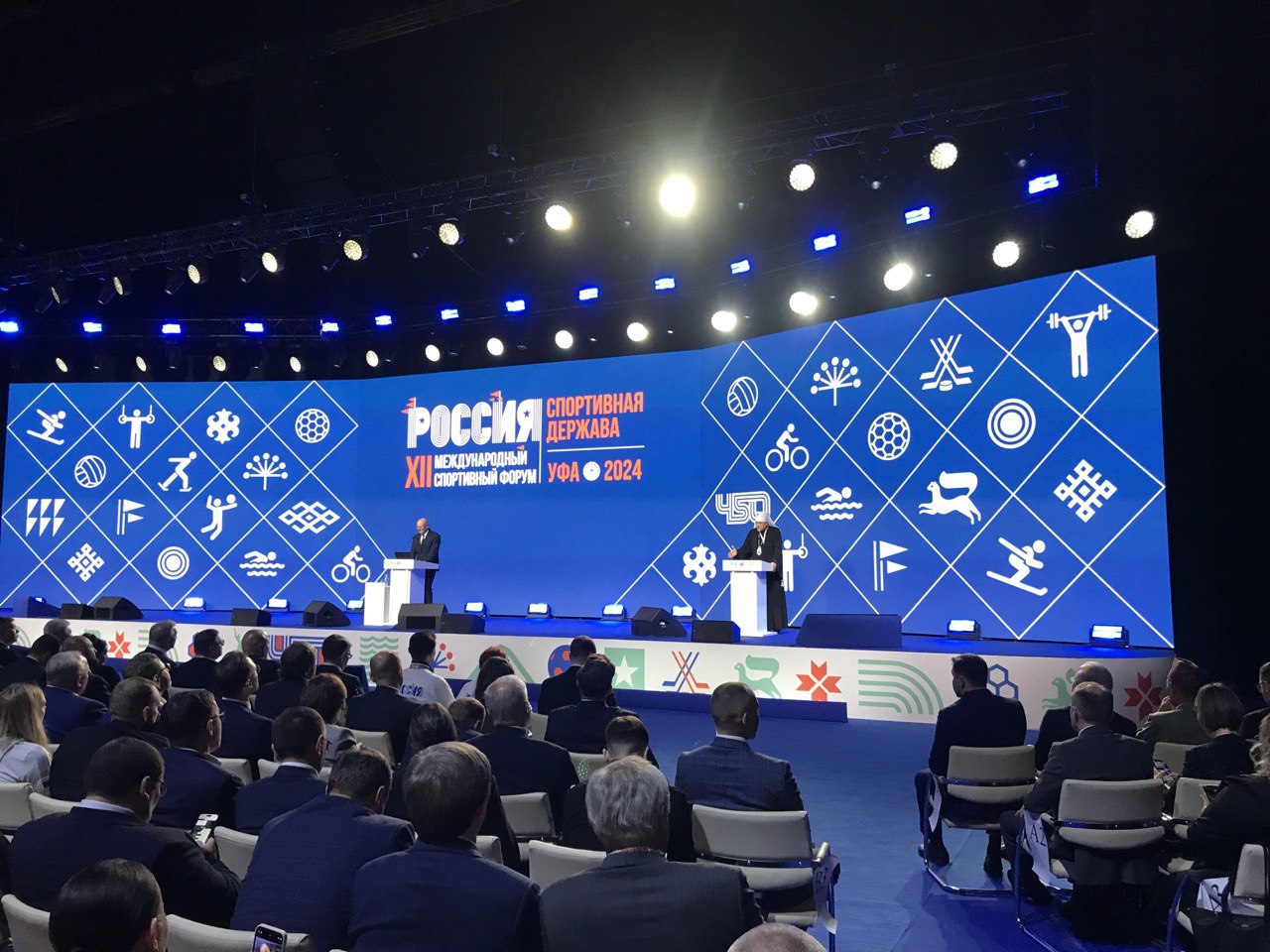 17 октября 2024 года во Дворце борьбы г. Уфы состоялось пленарное заседание XII Международного спортивного форума «Россия – спортивная держава» (форум стал первым мероприятием на открытом накануне спортивном объекте).